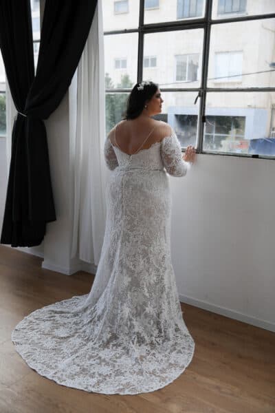 The Penelope bridal gown embodies timeless romance inspired by Italian style wedding dresses. Made from exquisite French lace, its off-the-shoulder neckline with long sleeves and a fitted bodice creates a flattering silhouette. The full flowing skirt brings movement and grace, echoing the effortless elegance of Italian bridal fashion. Penelope is the ideal gown for the bride who dreams of a wedding filled with classic beauty and la dolce vita charm.
