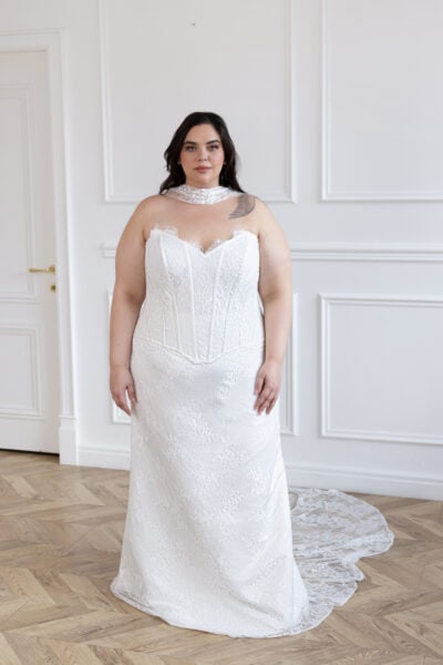 The Trinity gown is a sophisticated masterpiece that channels the drama and refinement. With a fitted silhouette and a dramatic train, this gown exudes regal beauty. Its plunging neckline, intricate lace, and delicate beadwork create a captivating play of light and texture. A subtle front slit adds a modern edge, while the supportive corset ensures a flawless fit — perfect for brides seeking timeless Italian-inspired romance.