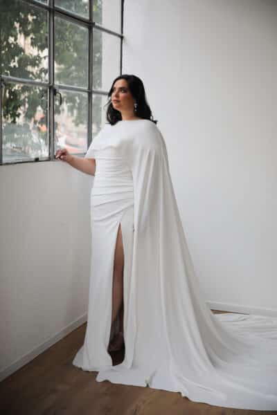 The Orchid with Cape bridal look embodies this beautifully. The clean silhouette feels luxurious and composed. The cape adds movement and drama without overwhelming the look. The high slit brings just enough sensuality, while the overall styling feels sleek, expensive, and impossibly chic.